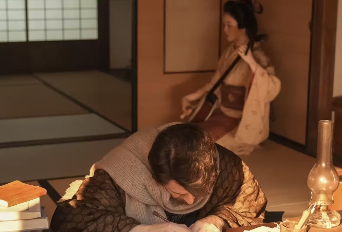 トキは床の間にお花を飾り、ヘブンの執筆中には三味線を弾きます。