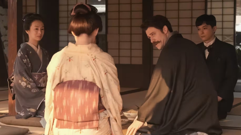 トキが、お花、三味線、茶の湯はタエから教わったと説明し、うなずくヘブン。そして、タエの挨拶と三之亟の挨拶。トキが三之亟は社長であるとヘブンに説明しますが、途端にヘブンの顔は曇ります。