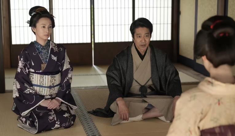 18年前の回想シーンでは、傳が赤ちゃんを司之介に渡し、タエはそれをなんともいえない悲しそうな顔で見ています。
