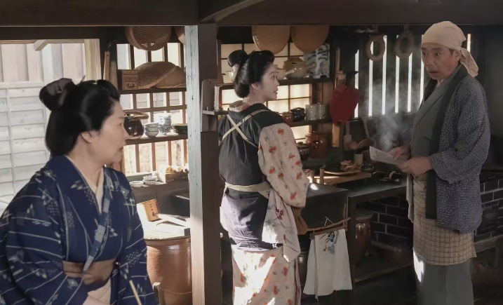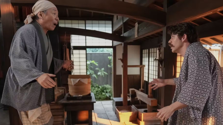 そこはトキたちが住む長屋。ヘブンは勘右衛門をという本物の「サムライ」を見て感動。しかし、「ついに来た!隠岐で異国船見張り番を務めたわしが務めを果たす時が。ペリー!」と木刀を振り上げる勘右衛門。あとから走ってきた錦織がヘブンを守り、トキたちが勘右衛門を押さえます。