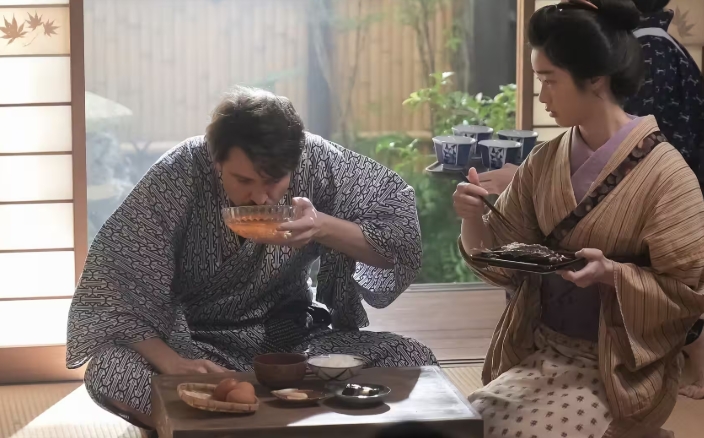 ツルがヘブンに浴衣を着せると、ヘブンはとても気に入った様子で「オビ、ノリ、ミタイ」と鏡を見ています。錦織が今後のスケジュールの確認をするというと、ヘブンは、座敷に用意した椅子に座らず座布団へ座ります。