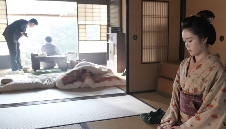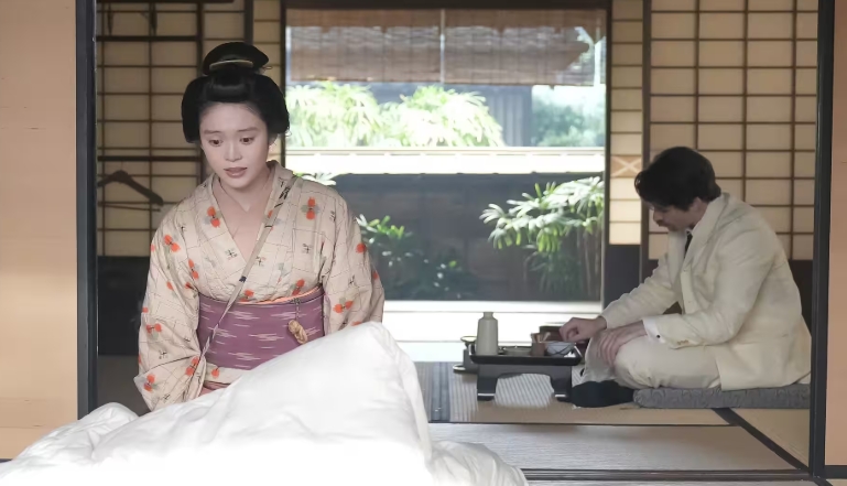 トキは覚悟を決めて布団の脇に座っていると、ヘブンが「フトン。ア~ア~、フトン、フトン」と言い畳む仕草をします。トキがようやく理解し、布団を畳む仕草をすると「ハハ!イエス!プリーズ」とヘブン。