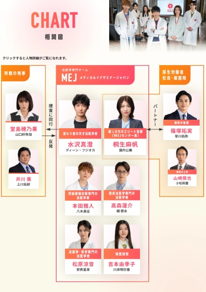 「MEJ(メディカルイグザミナージャパン)」は、厚生労働省主導で立ち上げられた法医学専門チーム。警察への調査指示や解剖の決定など、死 因究明において捜査権限を持っています。