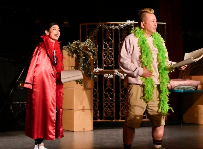 頭がロバになったボトム役はうる爺。うる爺はすでにロバの頭に見立てた段ボールをかぶり、「ん?みんな、何でびっくりしてるんだ。そうか、ロバだけに狼狽してるのか!なんちゃって」と。その後もアドリブ全開で周りの笑いを誘いますが、久部は激怒。リカが仲裁に入りました。