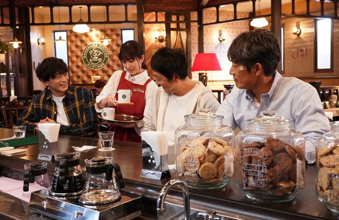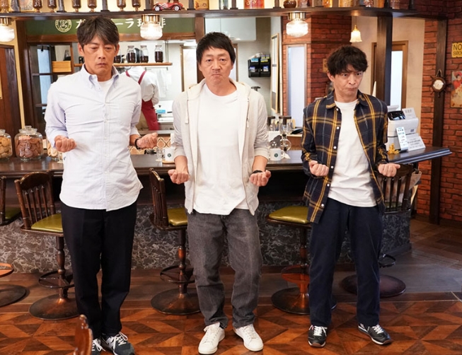今度はこの店の昔の話で盛り上がり、奥の休憩室を部室として使わせてもらっていたと話し出すと、3人の話は止まらず、自分達で撮った映画のことになりポーズまで決めてしまいます。
